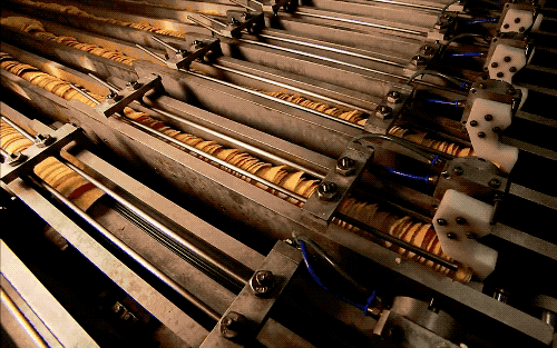 搅拌好的面团被运输到螺旋喂送器这里,然后掉到下面的压片区域。