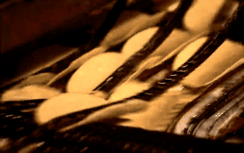 然后,有了造型的薯片就在油炸机的热油里炸 11 秒。