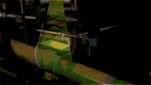 纸筒经过一个皮带,它可以把纸上的胶水和纸压在一起。接着,外包装纸也被这样一圈一圈地绕上去。