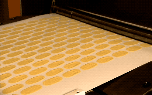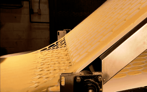 这就要靠下面这步关键操作了。在传送带的末端,薯片会被风吹一下,接着翻个面,掉入下一个传送带。