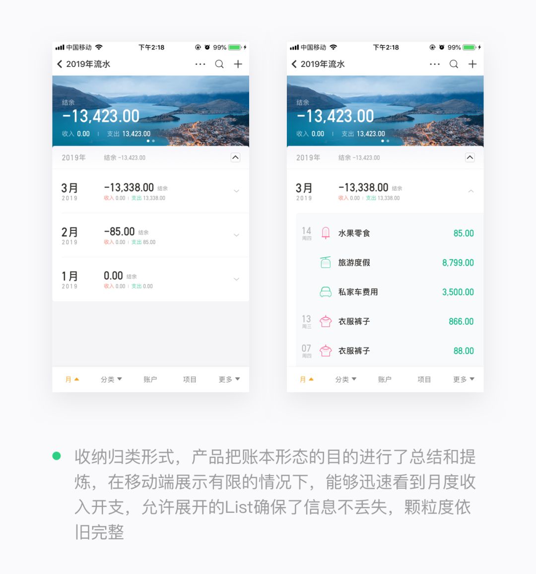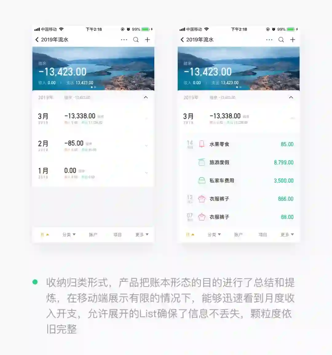 随手记的解决方法是将流水进行收纳处理,按时间维度来统领年度、月度账单情况,当用户希望详细了解时,再点开查看信息,在颗粒度不变的情况下,获得了简洁舒适的页面观感,消除了用户心理上的压迫感。