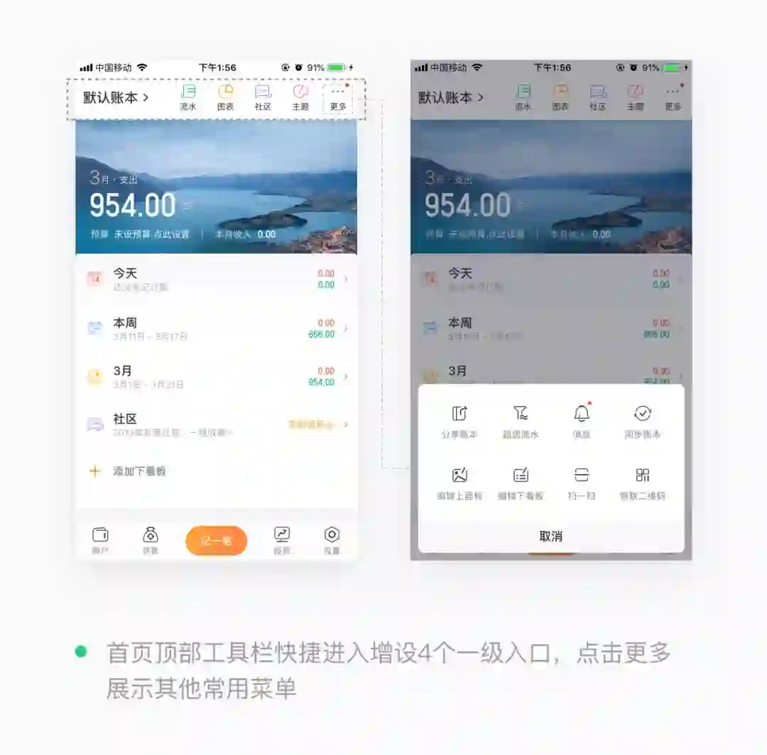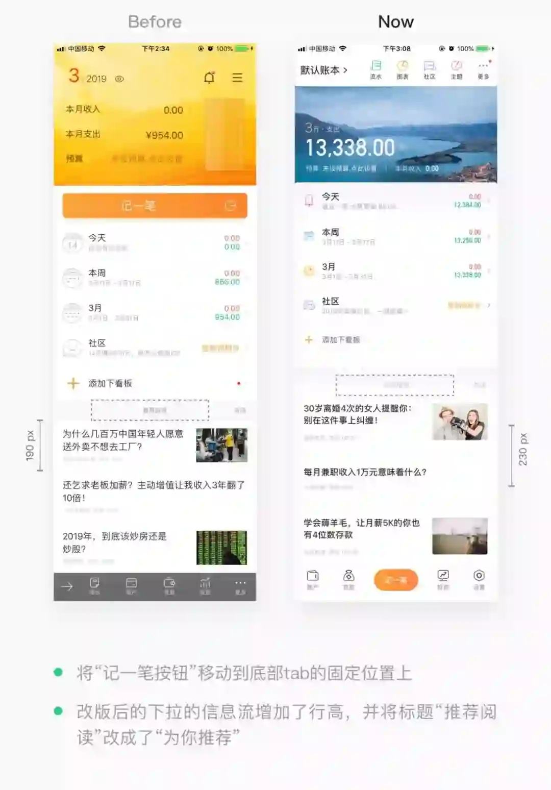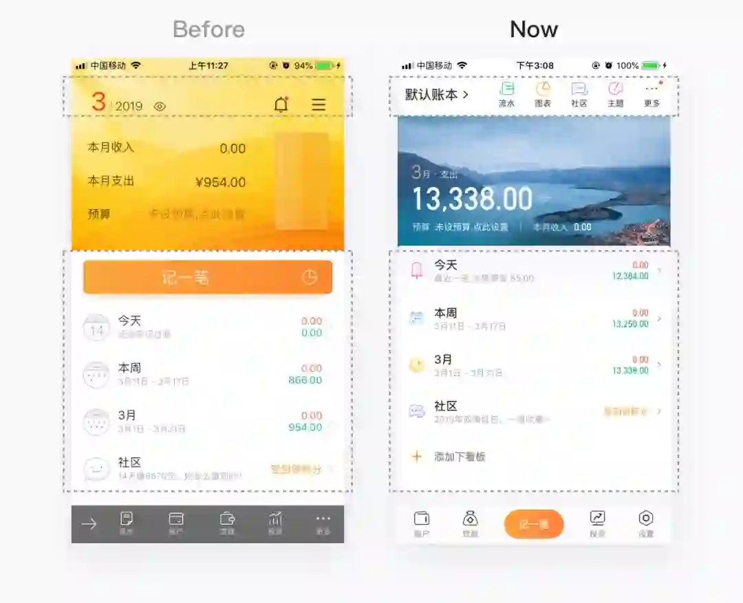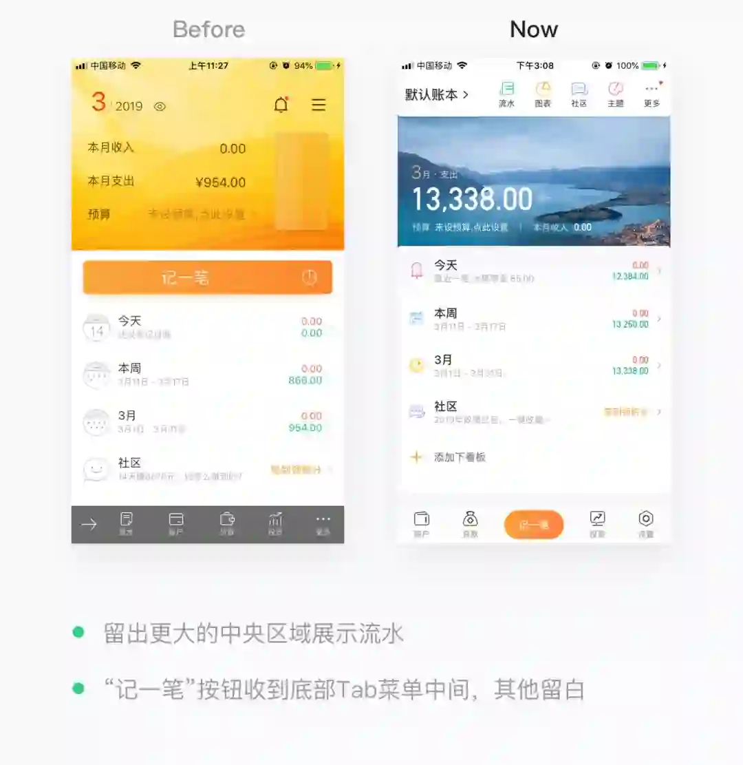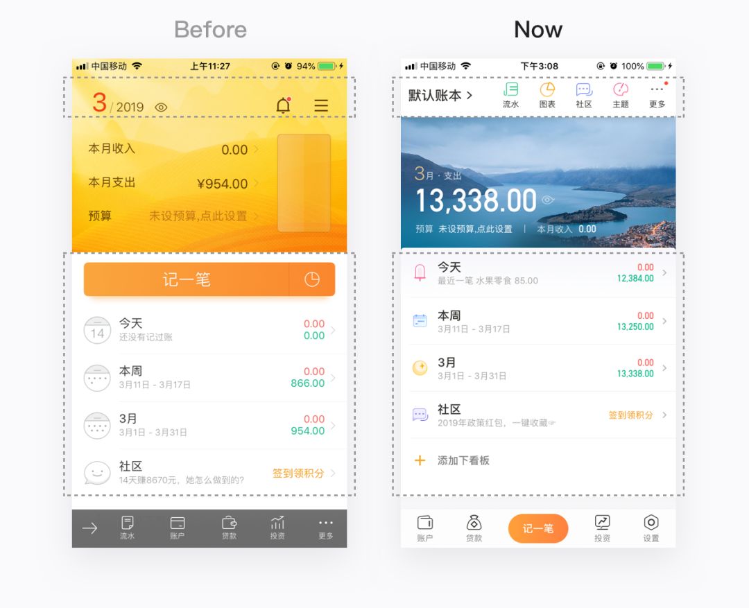 同时可以注意到:更改后对于中间区域和顶部区域,随手记有着更高的空间利用率。