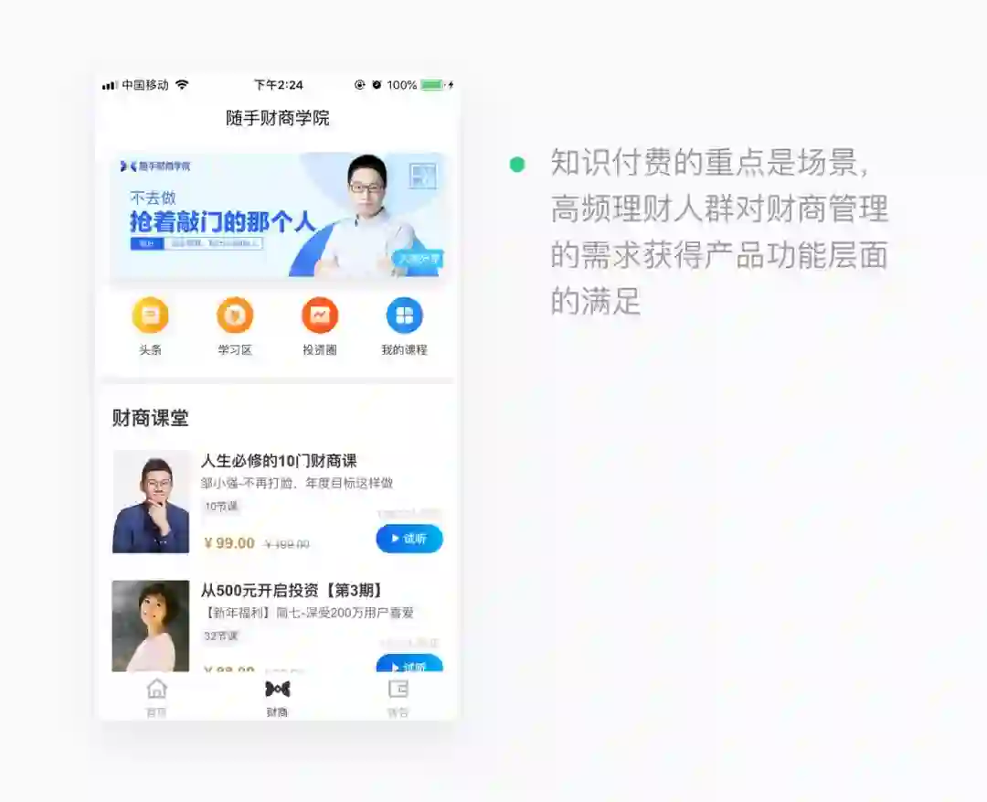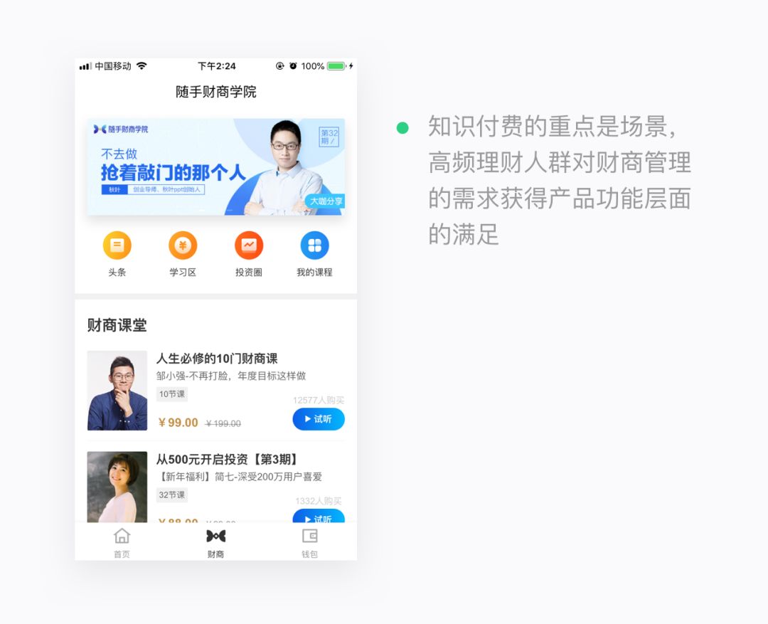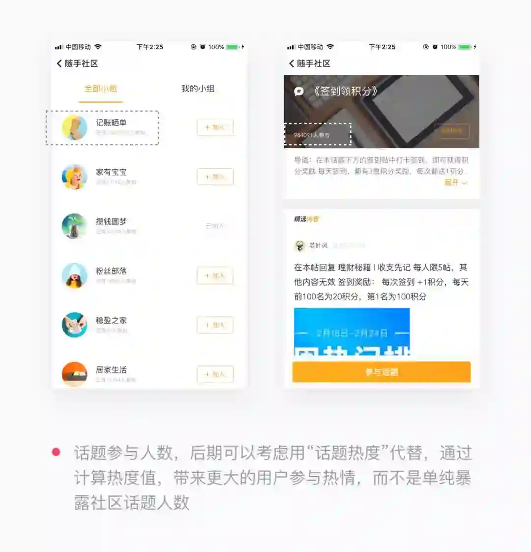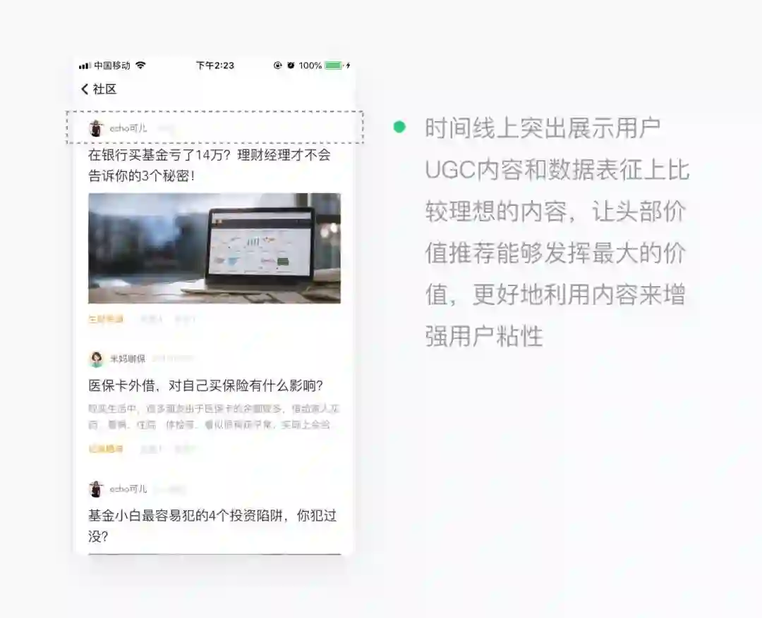 基于大数据算法的精准内容推送,滤筛掉了无效内容成就了表达的专业程度;在随手记社区中,给出的精选内容模块,是一个类似信息流App的时间线展示区,通过围绕账号、文章、频道(讨论组),建立用户使用粘性,教育引导内容消费。