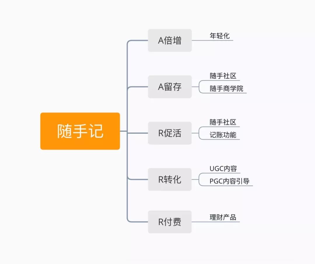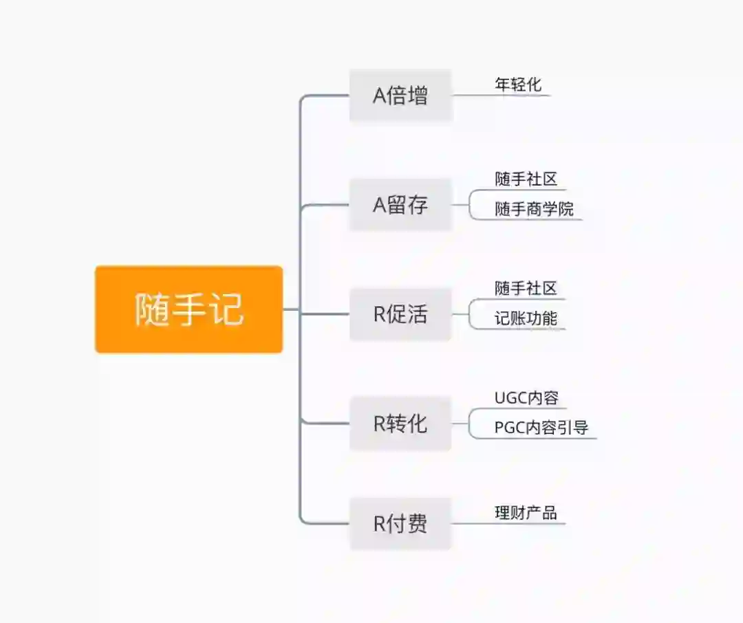 通过年轻化聚焦年轻人群,吸引用户使用记账理财产品;通过随手社区和随手商学院刺激推进留存活跃,强化记账功能认知,而UGC和PGC内容则扮演着转化(即传播)的角色。