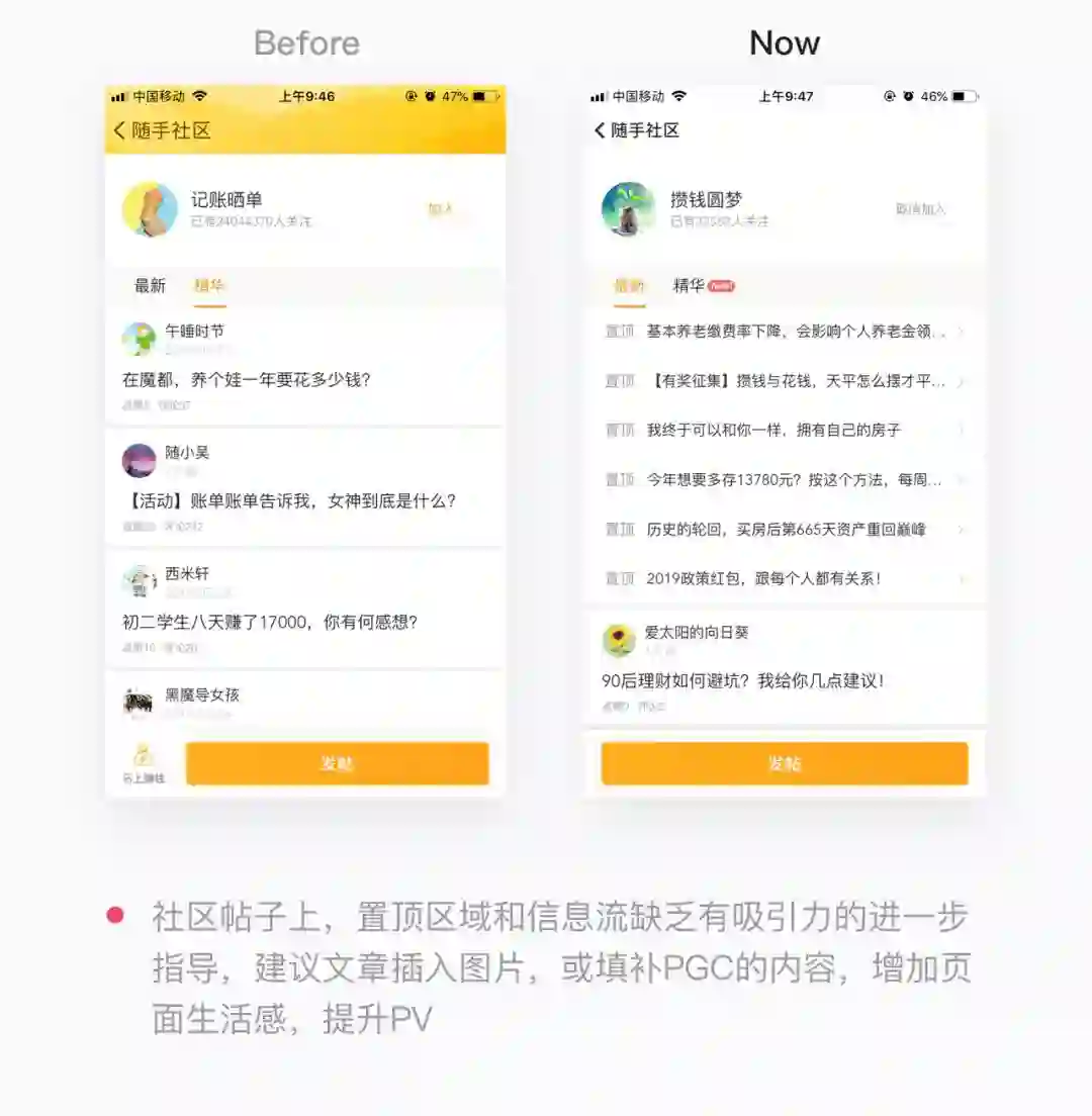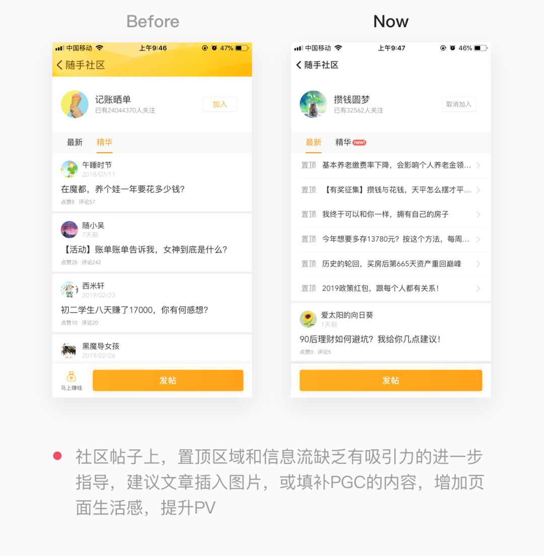 早在当初随手记支持增加公积金与支付宝流水时,我就成为了它的用户,其从流程上想方设法降低用户记账门槛;用户体验端,新增精华栏目+最新话题,从时事和社区两个维度提高应用内趣味性,进而达到用户投资教育和提高应用粘性的作用。