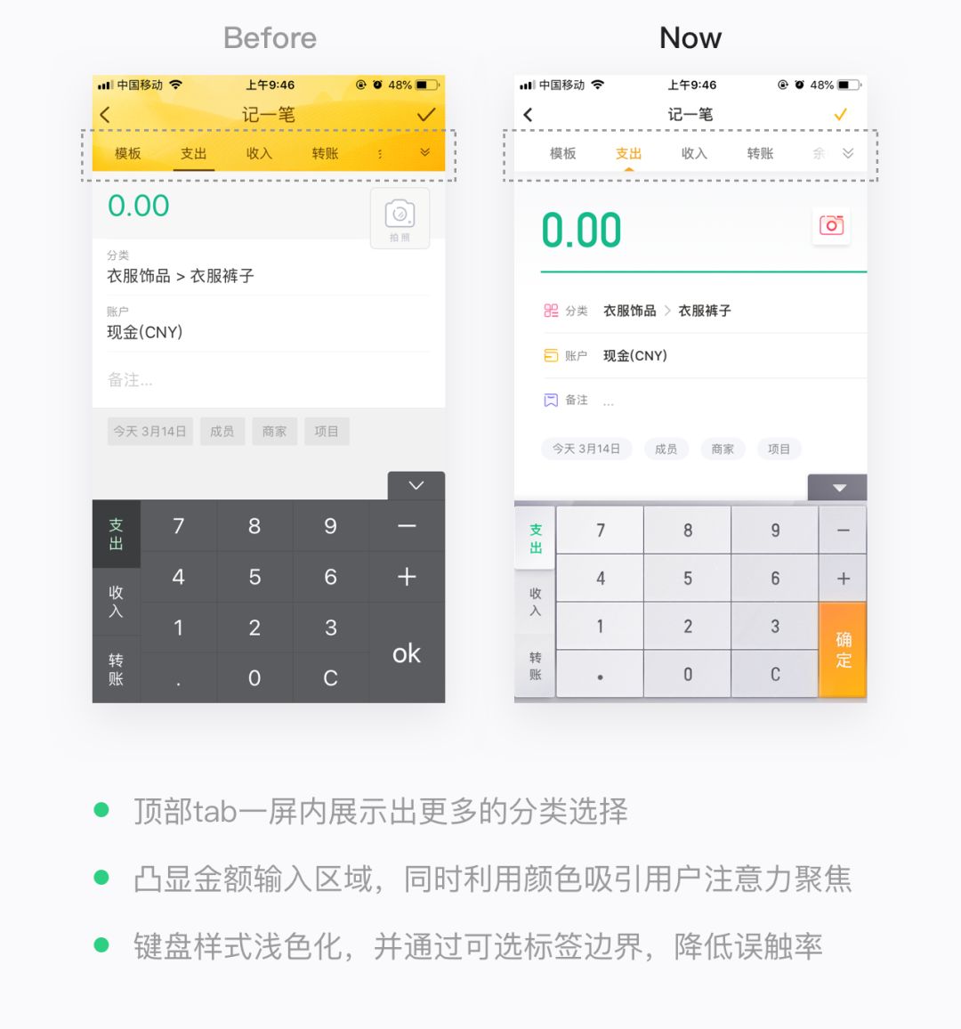 除了上述提到的界面形式,新版本设计层面如何让用户记账可以心无旁骛,获得沉浸体验,我们可以从记账行为这一动作切入分析,因为它最为关键也最体现着产品的思考。