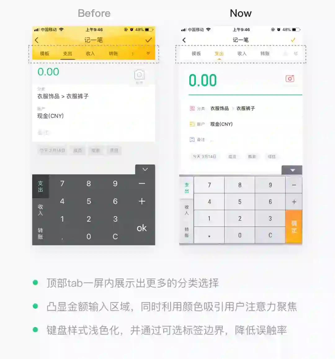 视觉重心和层次:通过重新调整界面文字大小,页面主次变得更加清晰,顶部tab菜单也增加了一个分类。同时重点调大了输入区域的文字大小,同时在分类、账户上,通过不同颜色的选择来达到标识的效果。(类似Mac OS中的文件颜色标注系统)