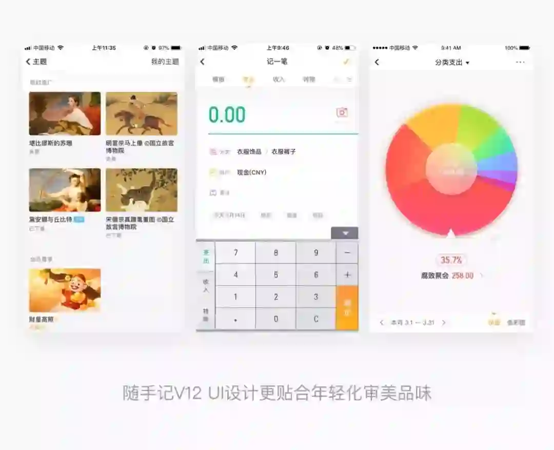 随手记从之前的深色Tab页签,改头换面为更具活力的亮色系,从主题换肤上设计多套视觉满足身份专属感,允许用户像使用表情一样,定义适合自己心情、个性的产品界面,可以说产品提振了自身的颜值,也给了用户更多产品身份与自己相符的暗示。