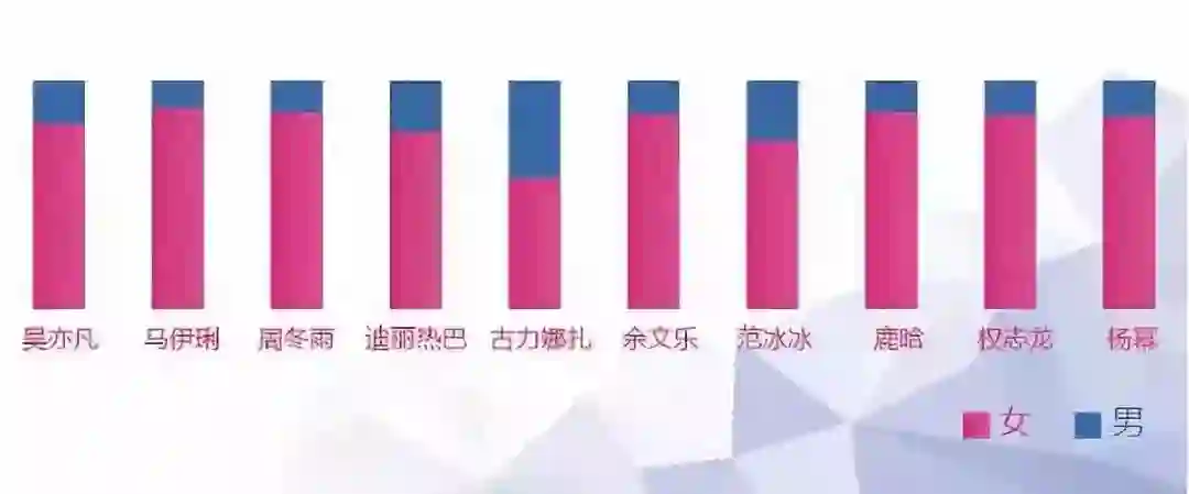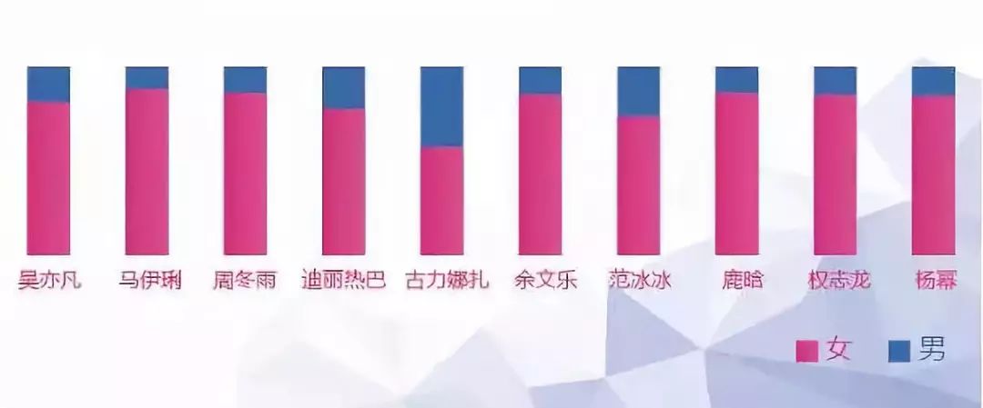腾讯《流量明星受众分析报告》显示,杨颖有33%的男粉,迪丽热巴是53%,杨幂44%,郑爽39%,Tfboys是49%,李易峰51%,鹿晗54%,吴亦凡53%,杨洋45%,乍看男粉不少,但阿里的《明星消费影响力报告》正相反,除了男女通吃的古力娜扎,所有明星不管本身性别,带货靠的都是女友粉和亲妈粉。