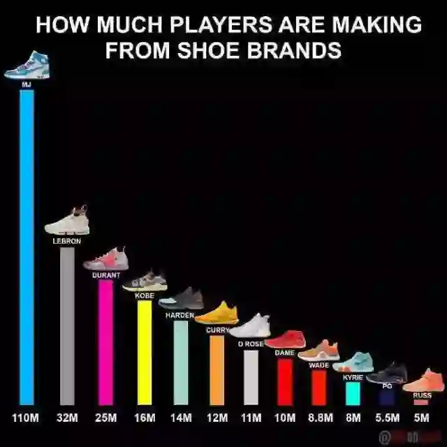 美媒分析了去年NBA球星的球鞋销售收入,发现乔丹、科比、韦德、詹姆斯和险些退役的德里克·罗斯等老牌球星全都在榜,冠军乔丹1.1亿美元是勒布朗·詹姆斯的3倍左右,杜兰特、哈登和库里三位当打球星分别只有2500万、1400万和1200万。