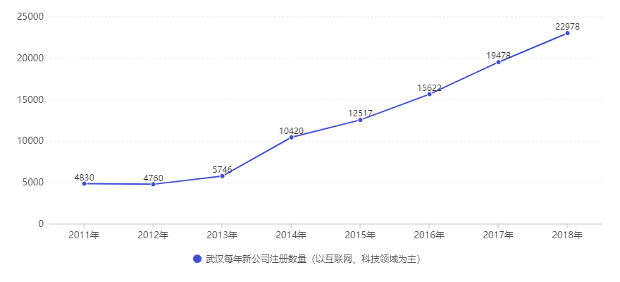 2013年武汉互联网、高科技领域新公司注册数量为5746家,到了2014年这一数据激增至10420家,涨幅达到181%。