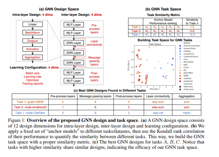 图神经网络(GNNs)的快速发展带来了越来越多的新架构和新应用。目前的研究侧重于提出和评估GNNs的具体架构设计,而不是研究GNNs的更一般的设计空间,后者由不同设计维度的笛卡尔积(如层数或聚合函数的类型)组成。此外,GNN设计通常专门针对单个任务,但很少有人努力了解如何快速为新任务或新数据集找到最佳GNN设计。这里我们定义并系统地研究了GNNs的架构设计空间,它包含了超过32种不同的预测任务的315000种不同的设计。我们的方法有三个主要创新:(1)一个通用的GNN设计空间;(2)具有相似度度量的GNN任务空间,这样对于给定的新任务/数据集,我们可以快速识别/传输性能最好的架构;(3)一种高效的设计空间评价方法,可以从大量的模型-任务组合中提取洞察力。我们的主要结果包括:(1)一套设计性能良好的GNN的全面指南;(2)虽然针对不同任务的最佳GNN设计存在显著差异,但GNN任务空间允许在不同任务之间传输最佳设计;(3)利用我们的设计空间发现的模型实现了最先进的性能。总的来说,我们的工作提供了一个原则性和可扩展性的方法,实现了从研究针对特定任务的个体GNN设计到系统地研究GNN设计空间和任务空间的过渡。最后,我们发布了GraphGym,这是一个用于探索不同GNN设计和任务的强大平台。GraphGym具有模块化的GNN实现、标准化的GNN评估和可重复和可扩展的实验管理。