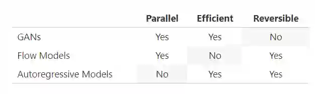 我们已经讨论过生成对抗网络和流模型之间的权衡,那么自回归模型如何?事实证明,自回归模型可以表示为不可并行化的流模型(因为它们都是可逆的)。在这种情况下,可并行化的说法有点不精确。我们的意思是流模型的采样通常必须按顺序进行,每次一个观测值。不过,可能有一些方法可以绕过这个限制。事实证明,自回归模型比流模型上在时间和参数上效率更高。因此,生成对抗网络是并行、高效但不可逆的,流模型是可逆、并行但不高效,而自回归模型是可逆的、高效,但非并行的。