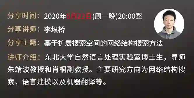 6月22日,东北大学自然语言处理实验室博士生李垠桥将带来主题为“基于扩展搜索空间的网络结构搜索方法”的分享,他在ACL、IJCAI等会议期刊发表论文若干,也曾多次参与 WMT、CWMT等机器翻译评测任务,主要研究方向为网络结构搜索、语言建模以及机器翻译等。