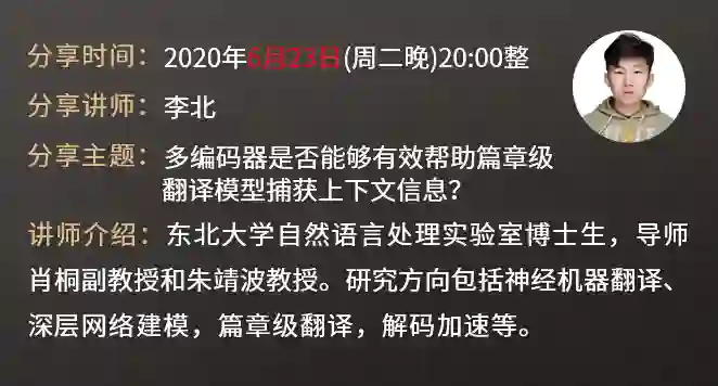 接着在6月23日,同实验室的博士生李北也将带来这次在ACL 的工作:"多编码器是否能够有效帮助篇章级翻译模型捕获上下文信息"。他的顶会论文发表经历同样丰富,先后在ACL、WMT、NLPCC、CCMT、中文信息学报等会议期刊发表学术论文若干,也曾屡次参加WMT、CWMT等机器翻译评测。研究方向包括神经机器翻译、深层网络建模,篇章级翻译,解码加速等。