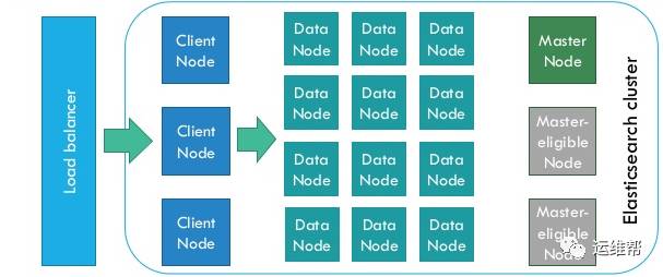 ElasticSearch是为分布式设计的,有很好的扩展性,在一个典型的分布式配置中,每一个节点(node)可以配制成不同的角色,如上图所示: