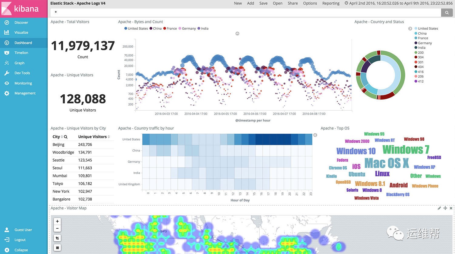 Kibana是一个针对Elasticsearch的开源分析及可视化平台,用来搜索、查看交互存储在Elasticsearch索引中的数据。使用Kibana,可以通过各种图表进行高级数据分析及展示。