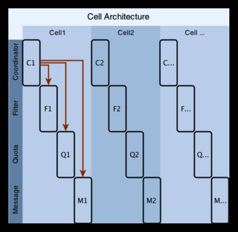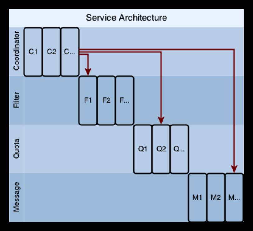 按照前面的分区方式,将群发服务的整体架构变成了一个类似Scatter-Gather+CQRS的方案,因为Gather不是一个请求处理的必须要素。也就是说,一个群发请求会被扩散到所有单元中,每个单元都要针对自己分区内的用户处理这个群发请求。