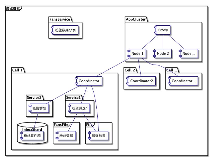 此次单元化改造基于微博现有的业务,因此这里也先行介绍一下。粉丝服务平台是微博的内容推送系统(代号Castalia),可为V用户提供向其粉丝推送高质量内容的高速通道(单元化之后已到达百万条每秒)。整个服务涉及用户筛选、发送计费、屏蔽检查、限流控制和消息群发等多个子服务。由于改造思想相通,这里以用户筛选和消息群发两个服务为例,下面两图分别为商业群发在服务化思想和单元化思想下不同的架构。