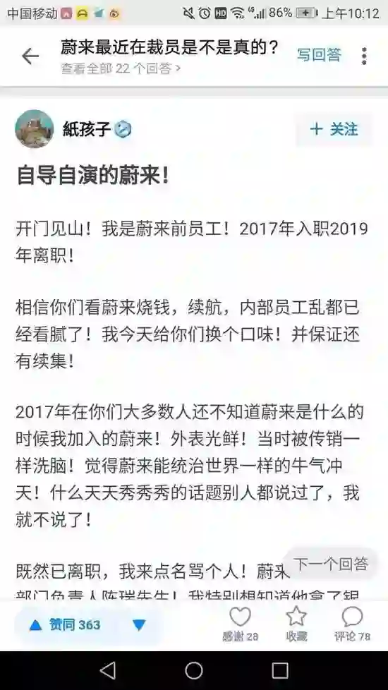 3月21日,凌晨四点左右,知乎上一名昵称为“紙孩子”的用户,声称自己是蔚来汽车老员工,并爆出了蔚来汽车的三个“内幕”:第一、蔚来汽车的信贷审核购车流程有问题。第二、去年李斌赌赢何小鹏的“一万辆”,只不过是自导自演的结果,其中多数为蔚来内部员工购买。第三、蔚来汽车最近在裁员,“紙孩子”就是被裁员工之一。发现消息的第一时间,第一电动立刻向蔚来汽车公关总监孙方圆连线求证,孙方圆一直未给出回复。随后不到半个小时,“紙孩子”的爆料内容已以“侵害企业利益” 为由被删除。(中国经济网)