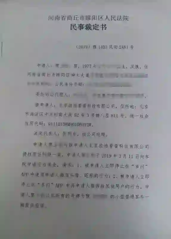 继被法学博士起诉、天津滨海新区法院发出诉前禁令后,一份报料内容显示,3月12日,河南省商丘市睢阳区法院也针对“多闪”下达了一份诉前禁令裁定书。根据原告窦某申请,并在窦某提供了自己一辆小轿车担保的情况下,法院裁定“多闪”的运营方北京拍拍看看科技有限公司停止在“多闪”中使用窦某的头像和昵称,停止将窦某推荐给其他用户。(第一财经)