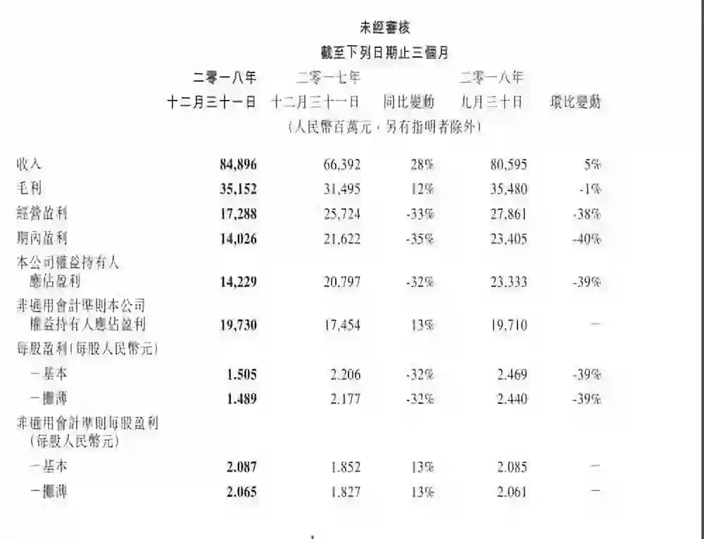 腾讯发布2018年度第四季度及全年财报。报告显示,腾讯Q4营收848.96亿元,同比增长28%,市场预期为833.8亿元;净利润(公司权益持有人应占盈利)142.29亿元,同比下滑32%,为2005年Q3以来第二次下滑,市场预期为188.5亿元;非通用会计准则下的净利润为197.3亿元,同比增长13%。这也是13年来腾讯季报首次出现净利润剧烈下滑的情况——上一次净利润下滑,还要追溯到2005年第三季度。