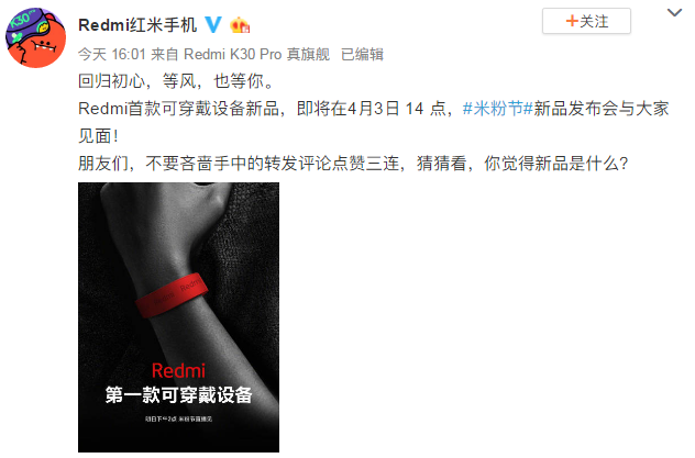 【Redmi首款可穿戴设备将于4月3日面市】Redmi于4月2日在官方微博宣布,将于4月3日下午2点米粉节新品发布会上发布其首款可穿戴设备。Redmi第一款可穿戴设备可能是Redmi手环。(微博)