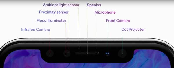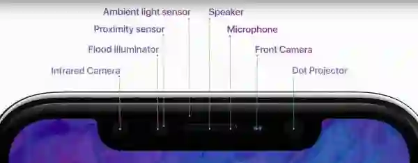 iPhone X的前置相机模块包括下图所示的这些传感器单元,从左至右分别是:红外镜头,泛光感应元件、距离感应器、环境光感应器、扬声器、麦克风、700万像素摄像头、点阵投影器。