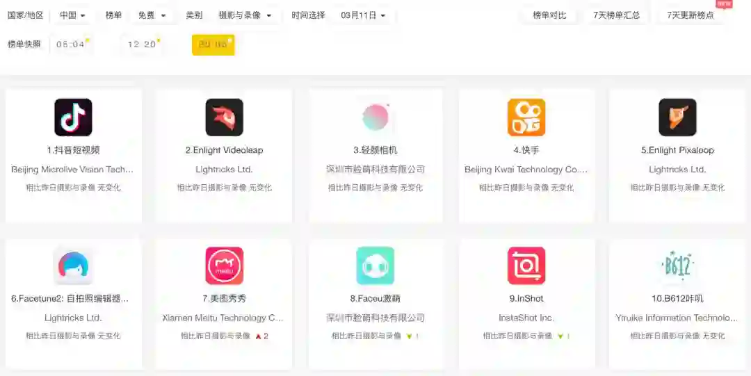 近期,在iOS商店的“摄影与录像”排行榜中,前十出现了多款来自于同一家公司的App。