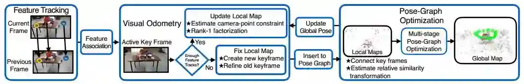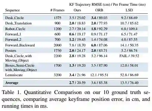 本文包含两个主要贡献。首先,作者用新的rank-1矩阵分解技术解决视觉里程计问题(经典的分解方法只针对正交变换或仿射变换的相机,作者的方法适用于透视变换的相机且无需知道投影变换中的深度信息),对于地图初始化造成的误差也更为鲁棒。其次,作者采用最新的全局SfM方法来处理Pose图最优化,得到多阶段的线性模型,同时能使L1优化对错误的闭环检测结果更为鲁棒。结合这两种方法,使得提出的方法可以得到更鲁棒的重建效果,而且速度明显比目前最先进的SLAM方法快(4倍,见下表)。
