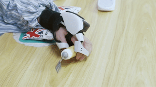 外骨骼康复手主要用于辅助中风患者进行手功能康复训练。这款设备采用穿戴式设计理念,设备外形符合人体工程学特征,能够完美贴合不同尺寸的手掌。此外,考虑到中风患者的上肢肌力较弱,念通智能设计的外骨骼康复手整体重量仅为310g,大大降低了患者在康复训练过程中的任务负担。