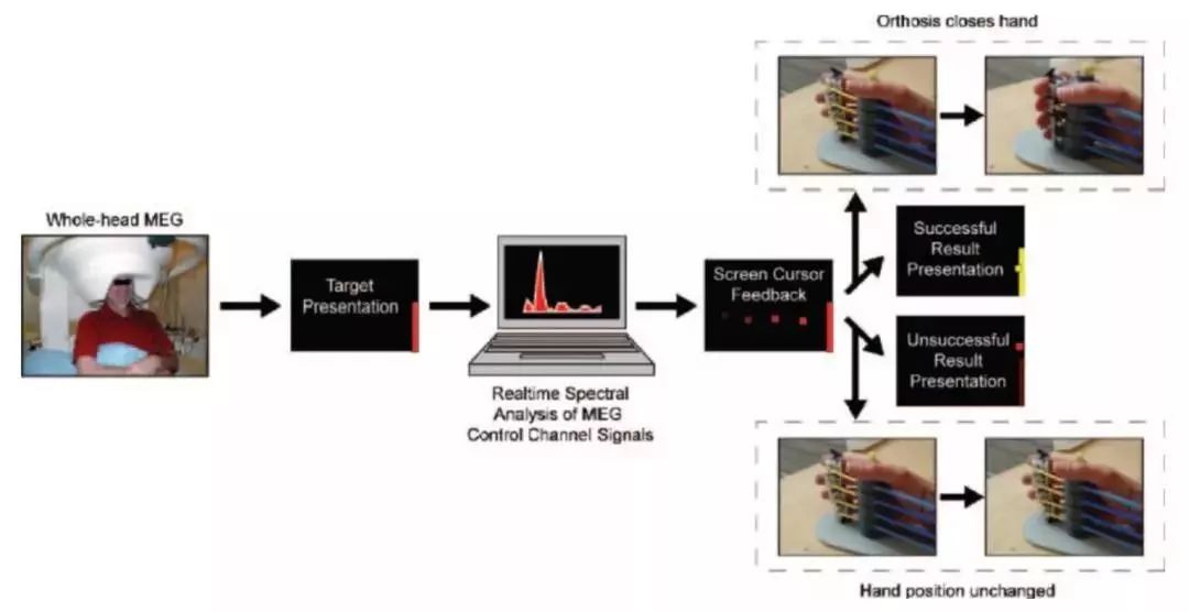 2008年,德国图宾根大学NielsBirbaumer教授首次实现了脑磁图(magnetoencephalogram, MEG)下的脑机接口康复系统。他们将患者的头部固定在庞大的脑磁图仪中,并执行患侧手的运动想象任务,当MEG信号中检测出患者的运动意图时,患者手掌佩戴的指关节矫形器就会辅助患者的指关节进行运动,从而实现脑-手联动,这是最早的脑卒中患者的手部运动功能主动康复技术。随后该团队又推出了基于脑电波的康复技术。