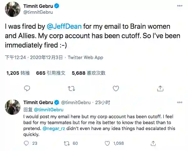 而后她在Twitter上表示自己在度假时被谷歌AI老大Jeff Dean的一封邮件开除,而自己却一点准备没有。