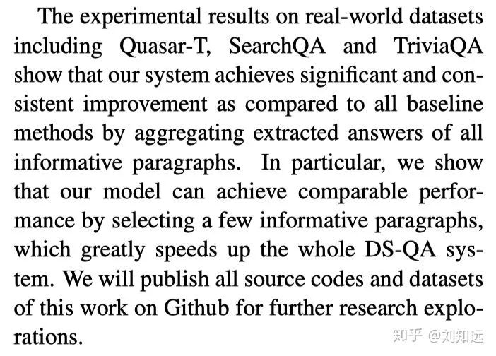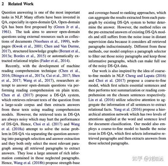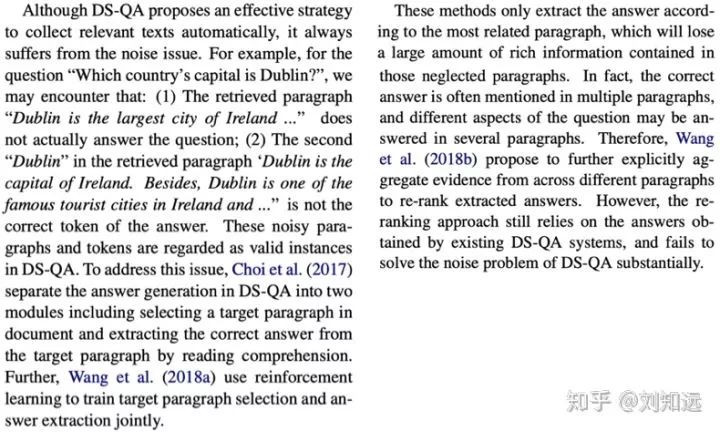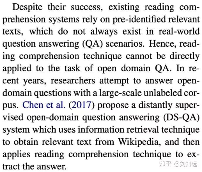 从研究任务递进一步,介绍这个任务的已有代表方法。如下所示论文 [2] 的第 2 段,开始介绍 DS-QA。需要注意,这个已有方法需要是目前最好、最具代表性的,也是本文工作准备改进的。所谓站在巨人的肩膀上,一篇值得发表的论文需要找到那个最高的巨人。