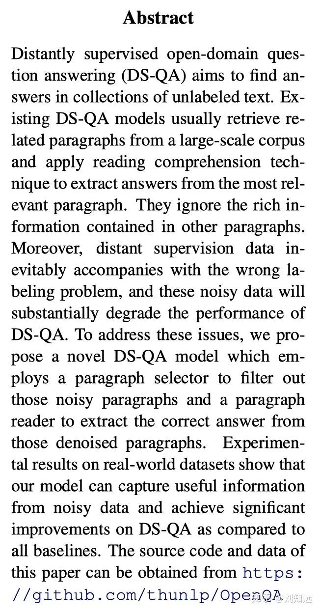 Yankai Lin, Haozhe Ji, Zhiyuan Liu, Maosong Sun. Denoising Distantly Supervised Open-Domain Question Answering. ACL 2018. http://nlp.csai.tsinghua.edu.cn/~lzy/publications/acl2018_qa.pdf