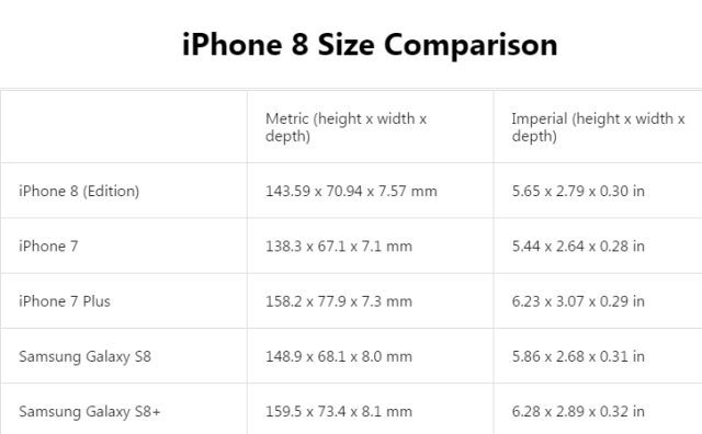 外媒iDROPNEWS给出了iPhone 8的实际尺寸:143.59×70.94×7.57毫米。介于iPhone 7、iPhone 7 Plus 之间,Home按钮可能会被Touch ID指纹扫描所取代。