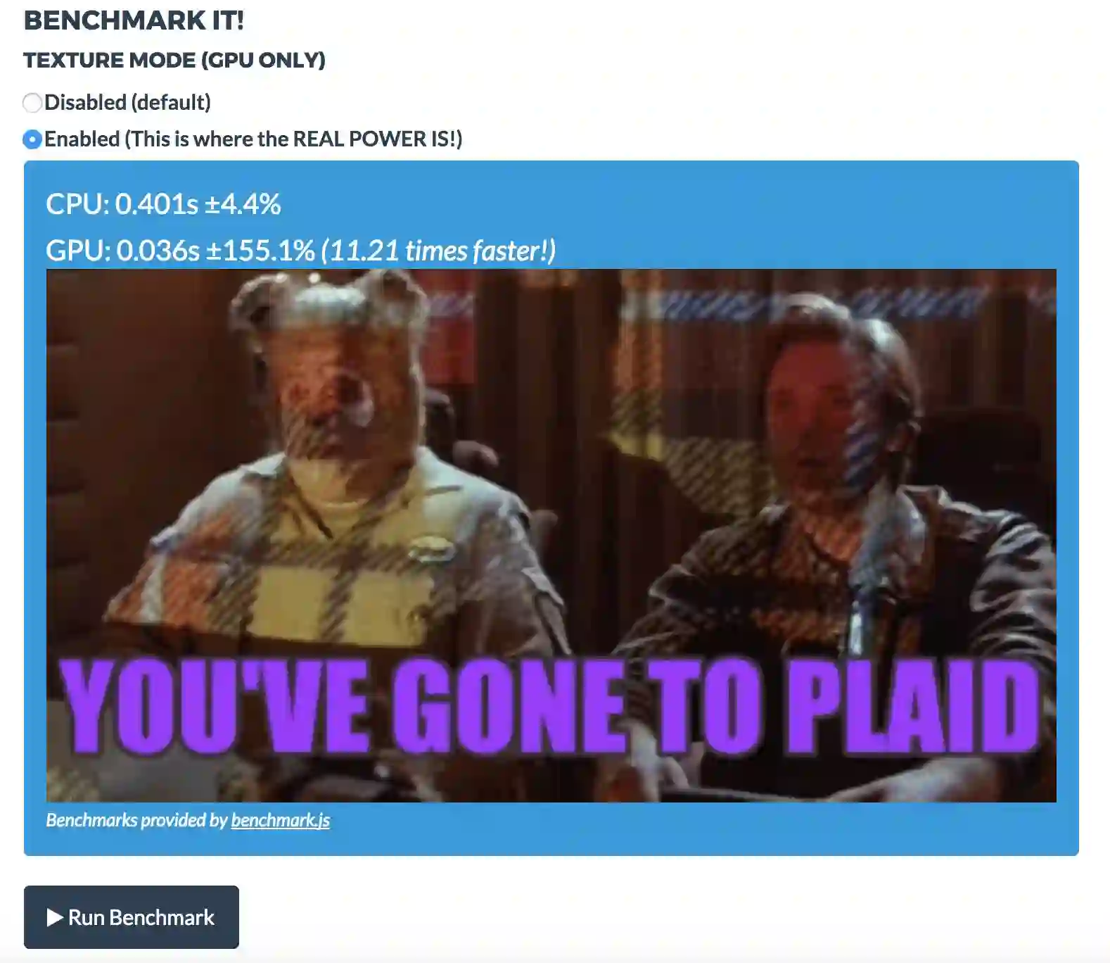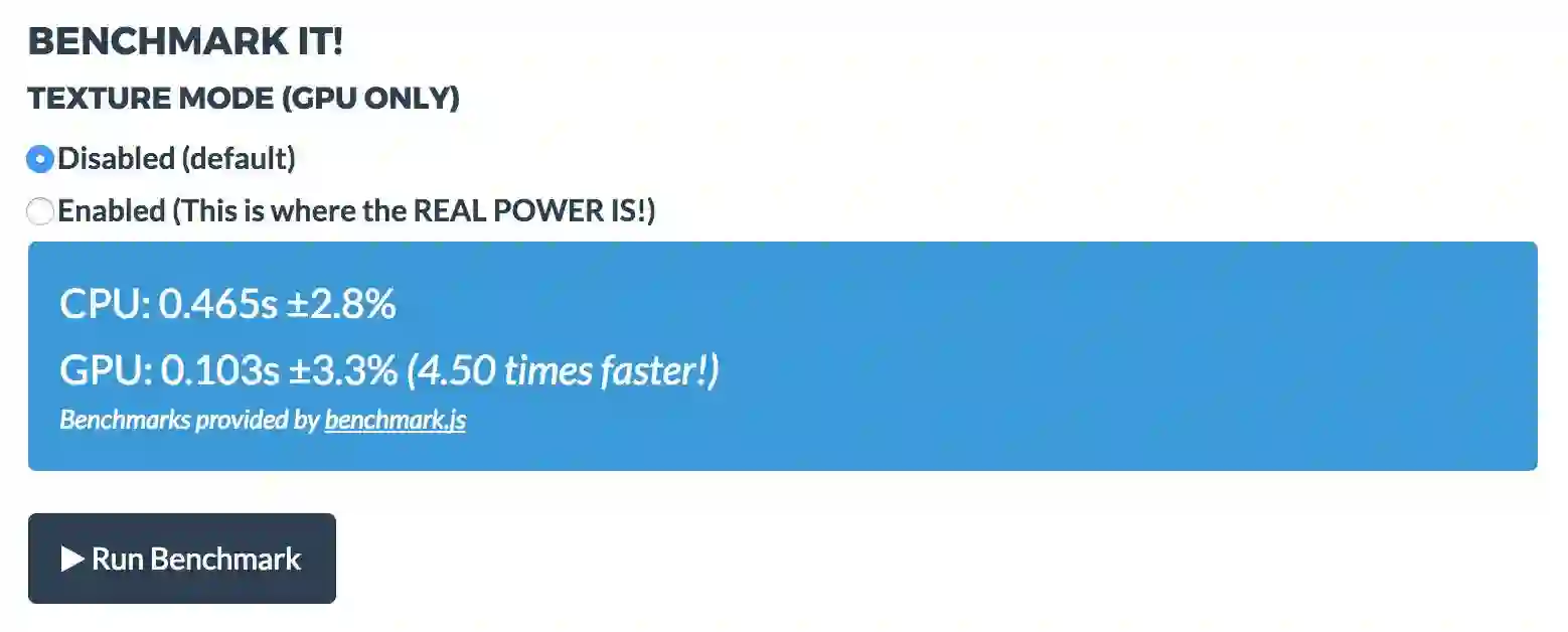 也就是说gpu.js这个库会把你写的js编译成GLSL然后在GPU上执行,以达到加速的效果。并且,如果电脑不支持GPU,它还会当成普通的js执行。可以先到gpu.js官网上体验一下,能达到5-10倍的提速。根据不同的电脑gpu配置,提速可能更多,这篇文章里面 https://hackernoon.com/introducing-gpu-js-gpu-accelerated-javascript-ba11a6069327 提到的Chrome提高了23倍,Firefox提高了125倍!