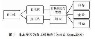 生本学习中,自主性是确保学生控制学习过程的重要因素,当学生自主决定并确立学习目标时,同样能够自觉控制学习过程。事实上,教师应该帮助而不是控制学生完成学习任务(Dochy et al.,2003)。通过转变内部控制机制,学生能够在运用外部资源时保持学习责任感。如图1所示,自主性支撑生本学习的两个因素:自主权与责任感。所谓自主权,意味着学生拥有确定学习目标的权力,自己控制实施方案,自主开展行动。当我们鼓励学生自主做出决定时,学生能够意识到自己在控制学习,同时会增强对学习的控制欲。相应的,学生也将为自己的目标、决定、行为承担更多责任,愿意控制学习过程、主动完成学习计划。