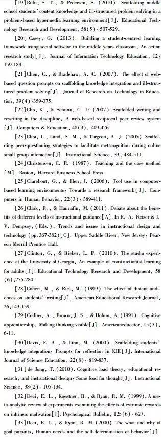 概念性支架能够帮助学生围绕学习主题组织相关知识并建立联系,明确哪些知识是已知的,哪些知识是需要学习掌握的,怎样在已知与未知之间建立联系,知识如何组织从而形成专业领域(Bulu & Pedersen,2010)。例如,麦格雷戈等(MacGregor & Lou,2004)为五年级学生的网络调查实践学习设计了概念性支架,并研究其影响。研究者制作了调研指导手册以及概念图模板,指导收集相关信息,围绕主题组织信息并建立关联。研究显示,指导手册提供了有序的综合线索,为学生鉴别信息、完成概念图提供了帮助。陈和布拉德肖(Chen & Bradshaw,2007)也设计了知识整合教学支架,要求大学生评论、理解并阐述教育测量核心概念。在研究非良构学习环境问题时,指导手册提供了可靠有效的帮助。在知识整合教学支架帮助下,学生们特别注重理解概念、在建立联系上下功夫,在开发验证解决方案以及考虑替代方案时表现突出。