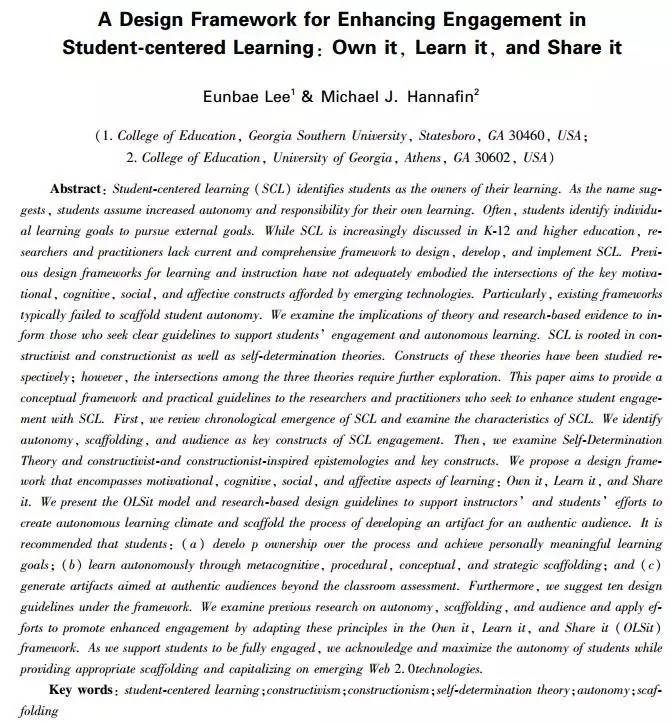 作者简介:李英蓓,助理教授,美国佐治亚南方大学领导力、技术与人类发展学院教育技术学,研究方向:生本学习环境设计、开发、应用与评估;迈克尔·J·汉纳芬,美国佐治亚州立大学教育学院教育心理学教授,当代国际知名教育技术专家,研究方向:教育技术。 译者简介:冯建超,副研究员,浙江传媒学院教师教学发展中心,研究方向:高等教育课程与教学;盛群力,教授,浙江大学教育学院课程与学习科学系,研究方向:教学理论与设计。