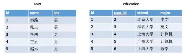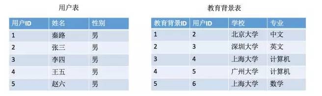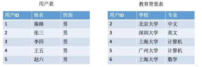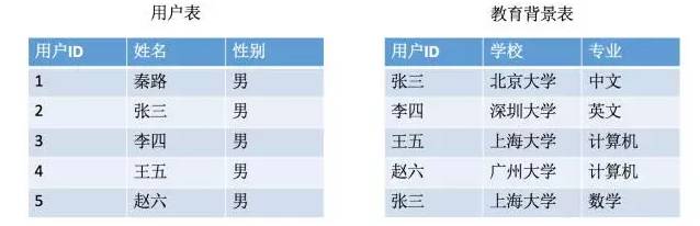 上面就是两张表,用户和教育背景,看上去能够使用姓名进行匹配,可是这里出现了两个张三,一个是北京大学,一个是上海大学,究竟哪个张三才能和用户表的张三对应上?都不能。
