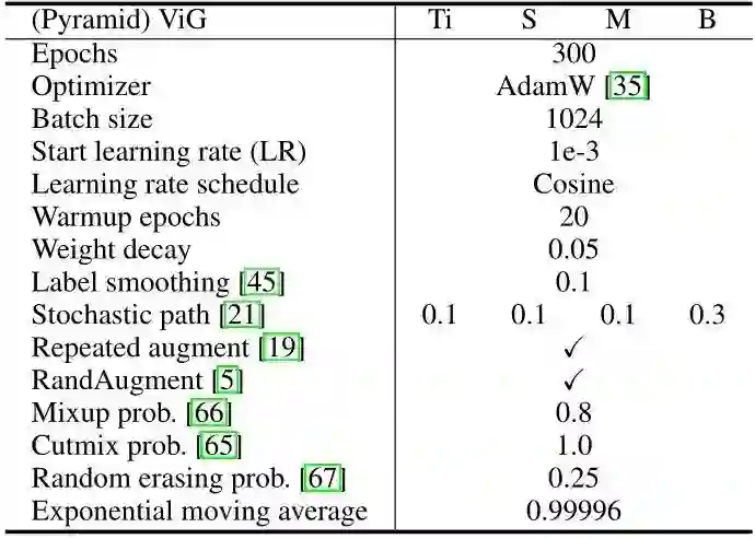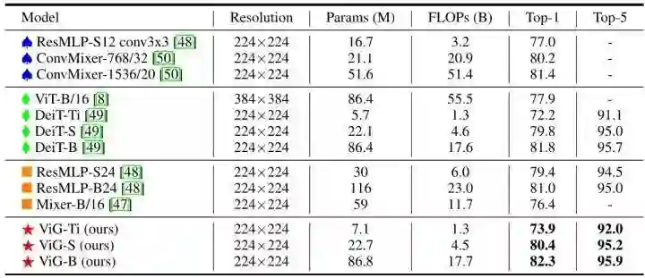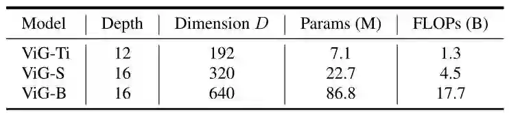 各向同性结构是指模型块从头到尾特征的尺寸都不发生变化。和 ViT,ResMLP 保持一致,作者设计了 ViG-Ti,ViG-S,ViG-B 三种不同的模型。节点数为 Patch 数196,为了逐渐扩大感受野,在这三个模型中,随着层的深入,邻居节点 的数量从9线性增加到18。默认情况下,head 数设置为 。