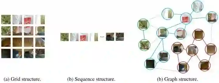 在网格表示中,像素或小块仅仅通过空间位置排序。在序列表示中,2D 图像被切分成为一系列小块。在图表示中,节点通过其内容链接起来,不受本地位置的约束。网格表示和序列表示都可以视为是图表示的特例。因此,将一张图片视为图是相对于前二者更加灵活且有效。