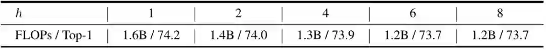 multi-head 操作允许 Grapher 模块在不同的子空间中处理对应的节点特征。作者将 head 数从1调至8,结果如下图11所示。head 数量控制着子空间的多样性。对于不同的 head,ImageNet 上的 FLOPs 和 Top-1 精度略有不同。作者选择 作为默认值,以实现 FLOPs 和精度之间的最佳平衡。