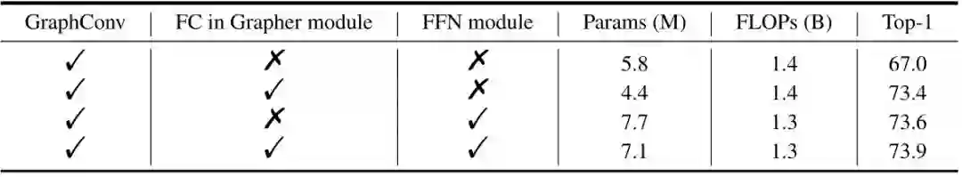 作者使用各向同性的 ViG-Ti 作为基础架构,在 ImageNet 分类任务上进行了消融实验。