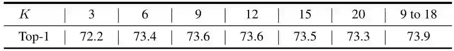 在构建图的过程中,邻居节点数 是一个控制聚集范围的超参数。太少的邻居会降低信息交换的幅度,而太多的邻居会导致过平滑现象的出现。作者将 从3调至20,结果如图10所示。我们可以看到,在9到15范围内的邻居节点数可以很好地执行 ImageNet 分类任务。