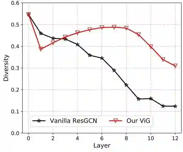 GCN 通过重复使用连续的几个图卷积层来提取图形数据的聚集特征。Deep GCN 中的过平滑现象会降低节点特征的独特性,并导致图像识别的性能下降。其中,多样性可以写成 ,其中 。为了缓解这个问题,我们在ViG块中引入了更多的特征变换和非线性激活。