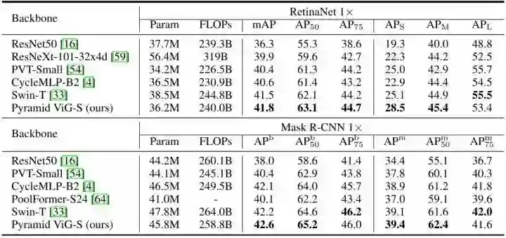 下图12是 COCO val2017 上的实验结果。为了进行公平的比较,作者使用 ImageNet 预训练的金字塔 ViG-S 作为 RetinaNet 和 Mask R-CNN 检测框架的主干。使用常用的 "1×" schedule 进行训练,以 1280×800 的输入大小计算 FLOPs。从下图12中的结果可以看出,金字塔 ViG-S 在 RetinaNet 和 Mask R-CNN 上的表现都优于ResNet,CycleMLP 和 Swin Transformer 等主干模型。