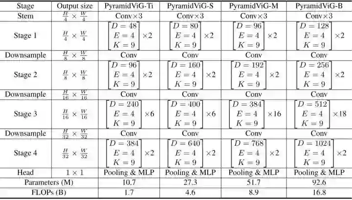 金字塔结构模型的特征图随着网络的深入而逐渐变小,已经被很多视觉 Transformer 模型 (如 PVT[2],Swin [3]等) 证明是有效的性能提升的手段。因此,作者进一步建立了四个版本的金字塔 ViG 模型,如下图4所示。