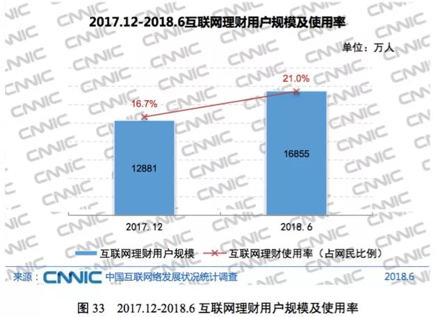 我国互联网理财使用率由2017年末的16.7%提升至2018年6月的21.0%,互联网理财用户增加3974万,半年增长率达30.9%。我国互联网理财用户规模持续扩大,网民理财习惯逐渐得到培养,资管业务打破刚性兑付有效降低金融机构业务风险,减少监管套利,同时进一步提升机构主动管理能力,推动互联网保本理财产品向净值型理财产品加速转化,货币基金发行放缓,促使互联网理财市场朝着合理规范化方向发展。